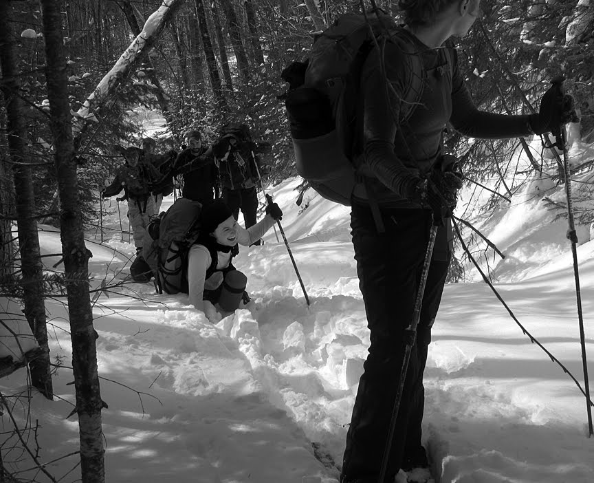 Livermore Road to Greeley Ponds trail to Kancamaus Brook trail to Livermore trail and down. 10 skiers. 5.5 hours. Sunshine and snowstorm. Lots of herring-bone steps in deep, soft snow.